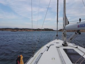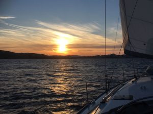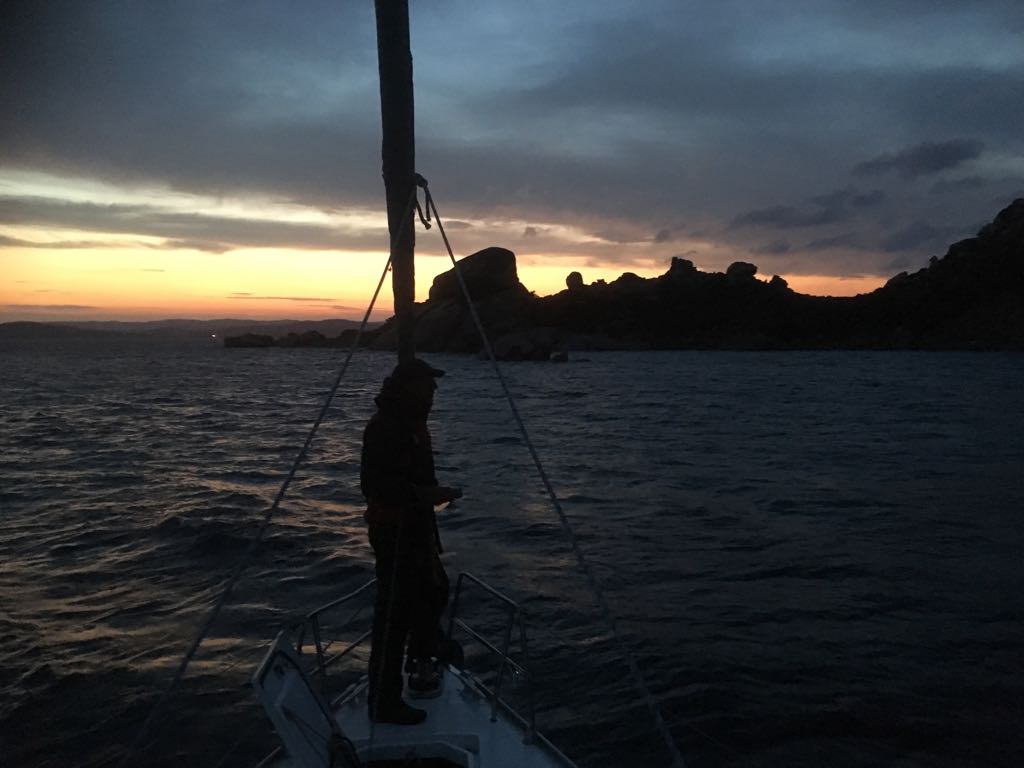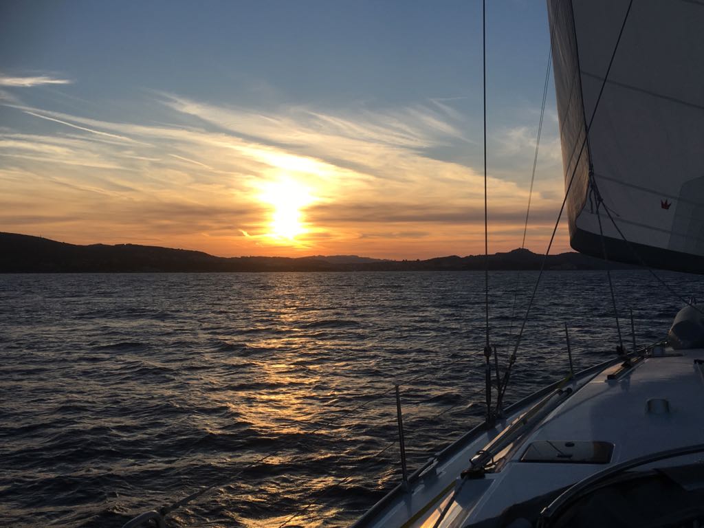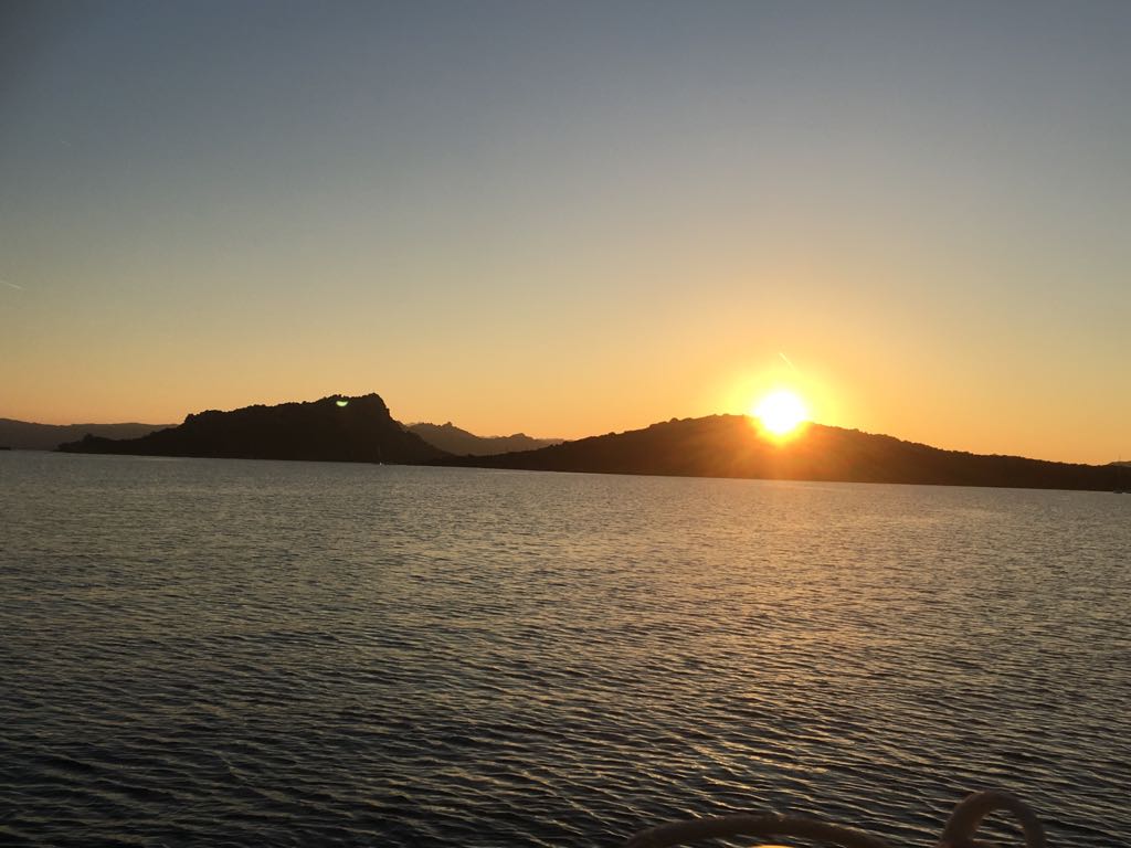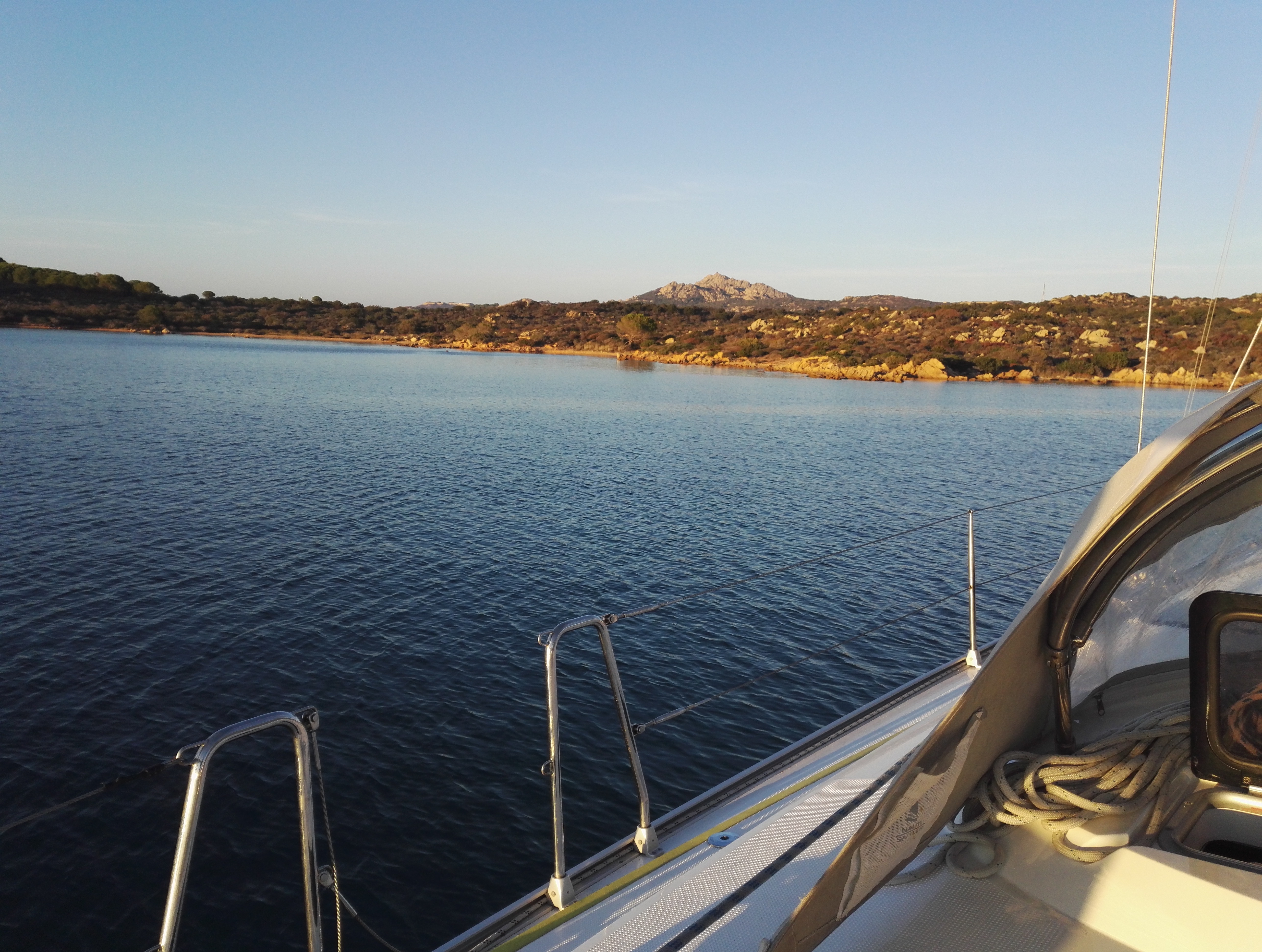 Einbisschen rumlungern und nach einer Einweisung durch den Skipper und Übernahme bestimmter Aufgaben durch einzelne Crew-Mitglieder wurde dann für 13:00 Uhr das Kommando „Leinen los“ gegeben. Etwas Segeln bei leichtem Wind und später dann auch leider unter Motor hat es uns in eine sehr schöne Bucht auf Caprera verschlagen, mit Sonnenuntergang und baden (für einzelne Mitsegler/innen).