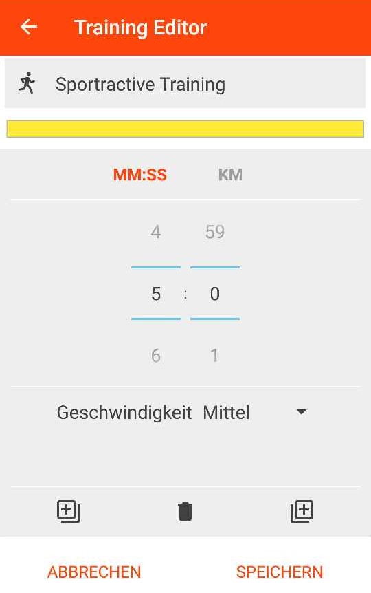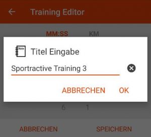 Diese Ansage kann in den Einstellungen -> Sprachausgabe -> „Training Geschw. Warnung“ auch abgeschaltet werden. - Ein bestehendes Training lässt sich bearbeiten. Klicken Sie dazu in der Übersicht lange auf den entsprechendne Eintrag und der Editor öffnet sich mit dem gewählten Traning.