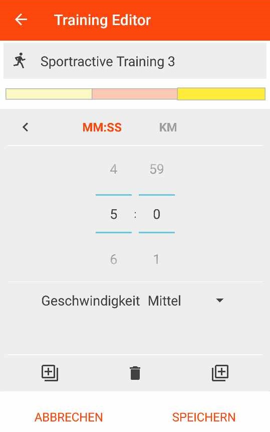 - Die Auswahl eines Intervalles erfolgt entweder als Dauer oder in Kilometer; im unteren Bereich wählen Sie die Geschwindigkeit (Langsam/Mittel/Schnell/Absolut)