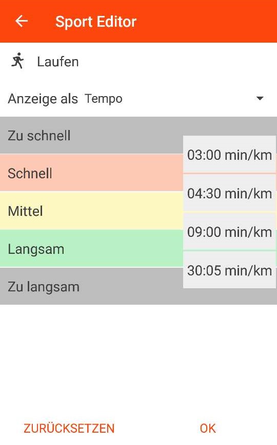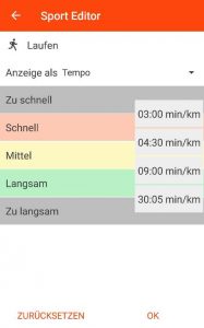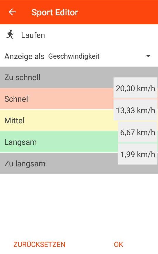 Die Geschwindigkeiten Langsam/Mittel/Schnell können in den Einstellungen bei „Einstellungen Sportarten“ individuell pro Sportart angepasst werden. Alternativ kann man mit „Absolut“ für jedes Intervall ganz frei die Grenzen definieren. Wichtig: Den Abstand zwischen den Grenzen immer groß genug machen. Die Geschwindigkeitsberechnung aus GPS Daten ist sehr träge und ungenau. Sind die Grenzen zu nahe beieinander bekommt man ständig den Hinweis schneller/langsamer (den man übrigens ja auch ausschalten kann).