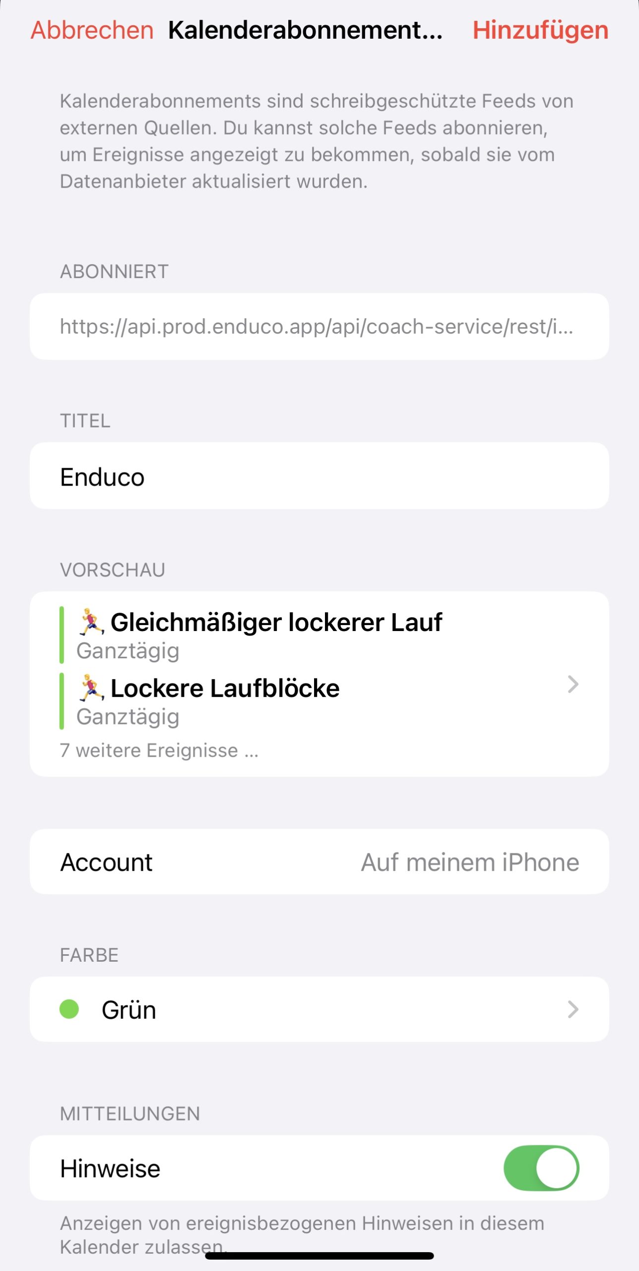 Wenn man sich auf dem iPhone befindet, klickt man für eine Verknüpfung mit dem Apple-Kalender einfach auf „Kalender hinzufügen“. Im nächsten Fenster kann man bequem noch den Namen und die Farbe auswählen und über „Hinzufügen“ die Verknüpfung abschließen.