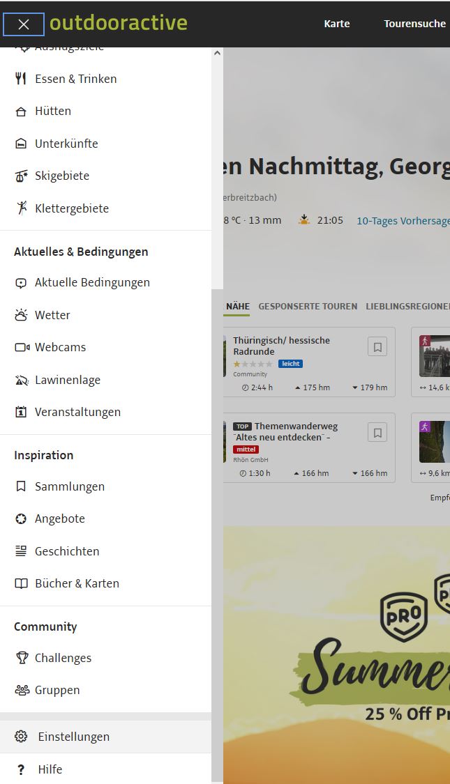 Zunächst muss man sich natürlich bei Outdooractive registieren und dann anmelden. Im nächsten Schritt öffnet man das Hauptmenü (links) und wählt den Punkt „Einstellungen“ (ganz unten).