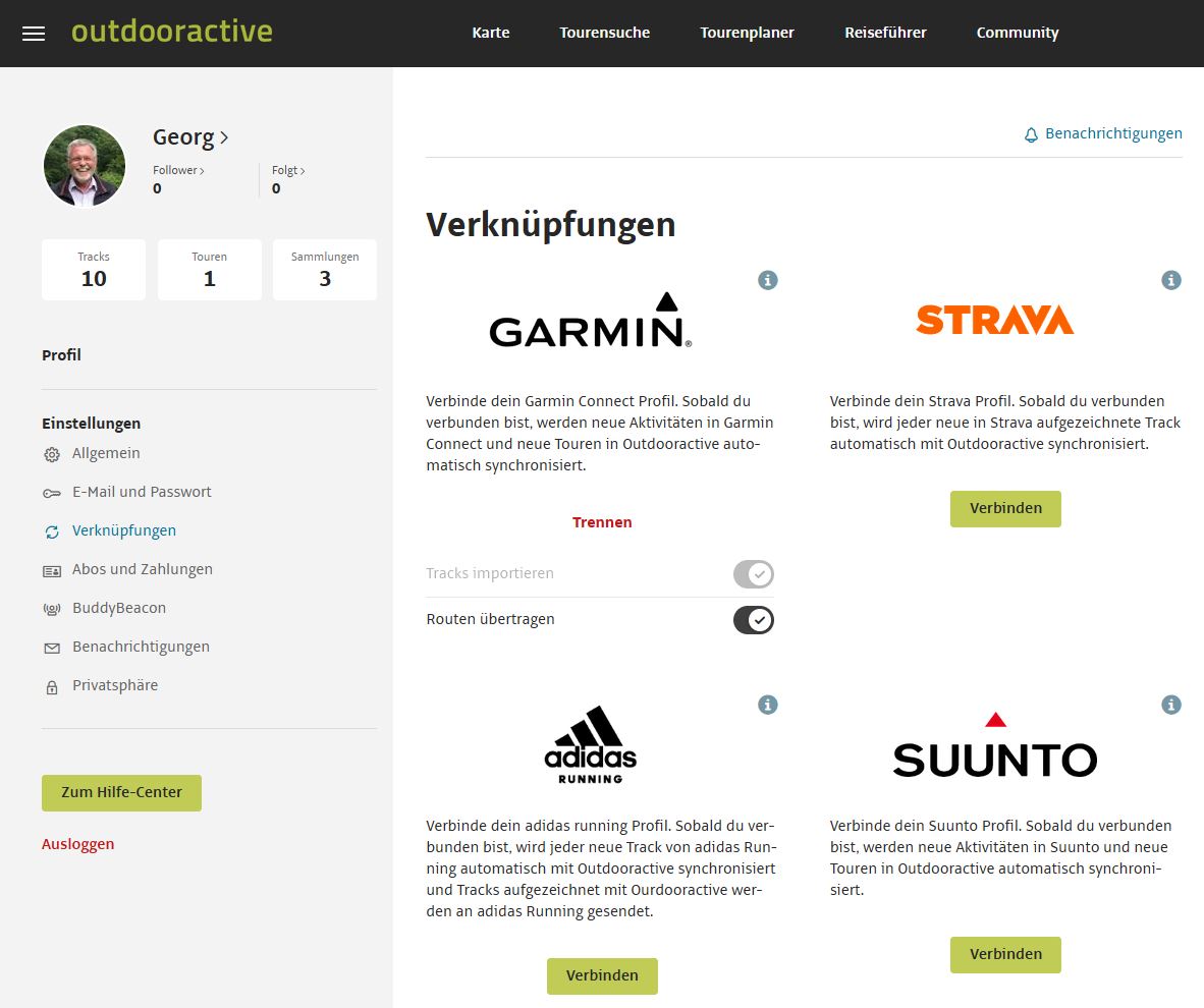 Hier wählt man den Punkt „Verknüpfungen“ und koppelt nun das Garmin-Konto. Dazu sind die eigenen Zugangsdaten erforderlich. Damit ist die wesentliche Voraussetzung für die Zusammenarbeit erledigt.