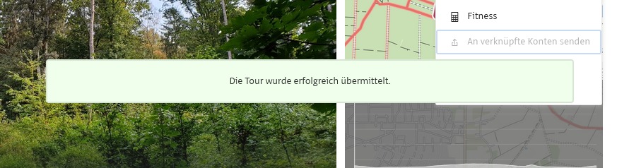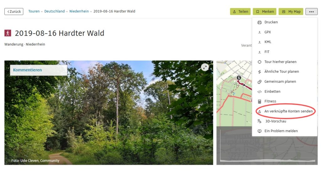 Im nächsten Schritt wird die Strecke mit weiteren Informationen angezeigt.Im „Drei-Punkt“-Menü auf der rechten Seite klicken Sie auf den Eintrag „An verknüpfte Konten senden“.
