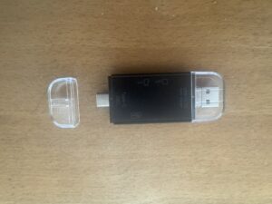Irgendwo habe ich noch diesen USB-Hub gefunden, Aber es will nicht recht gelingen. Vermutlich ist der SD-Karten-Einschub „ausgeleiert“ und – wie unten beschrieben – die Festplatte nicht richtig formatiert.