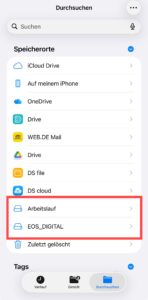 Alles am iPhone angesteckt und die iOS-App „Dateien“ aufgerufen. Im Abschnitt „Speicherorte“ wird die SD-Karte tatsächlich erkannt, jedoch nicht die Festplatte. Kleine Recherche: die Festplatte muss mit exFAT formatiert sein.