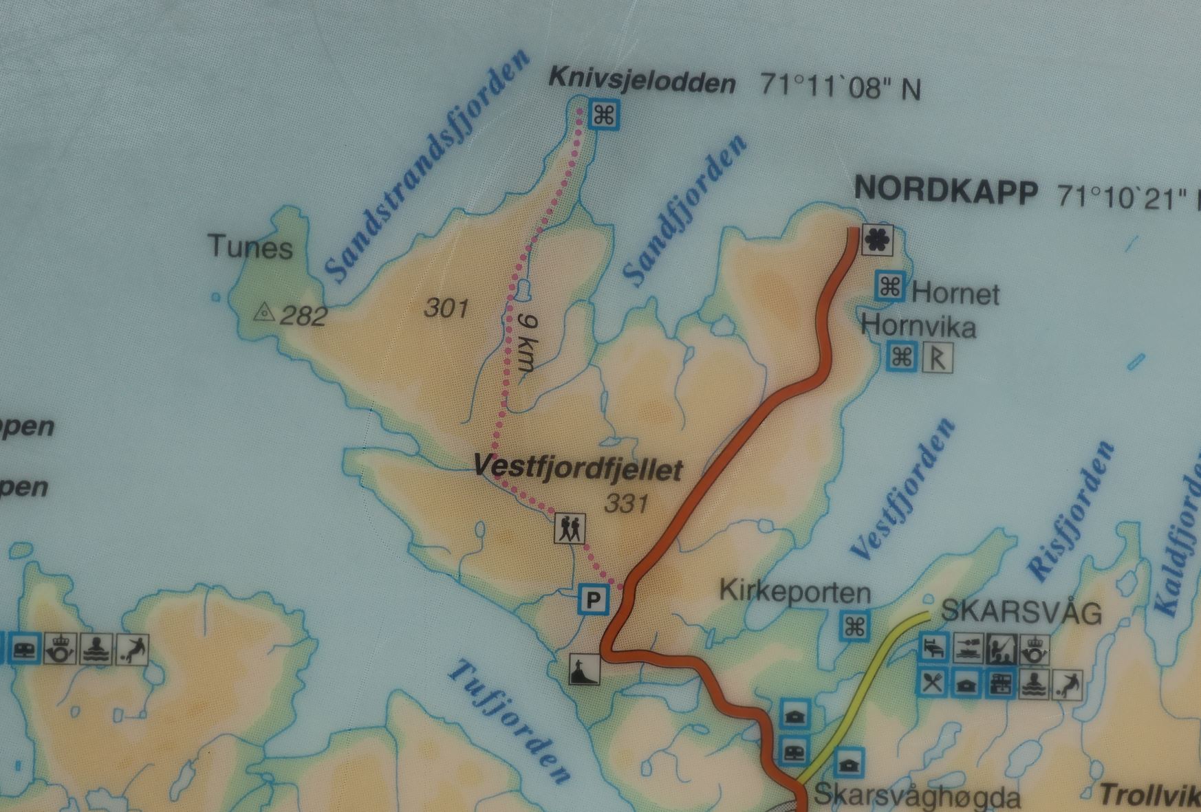 Auf der Strecke von Olderfjod zum Nordkap gibt es einen nagelneuen Straßentunnel, der die Strecke verkürzt in dem die Umfahrung einer Landspitze abgeschnitten wird. Dann noch eine Neuigkeit: Es werden am Nordkap keine Parkplatzgebühren mehr fällig. Dafür verlangt aber der Betreiber des Restaurants und Museums einen saftigen Eintritt von 320 NK. Noch nicht einmal in den Giftshop kommt man „ohne“ rein.