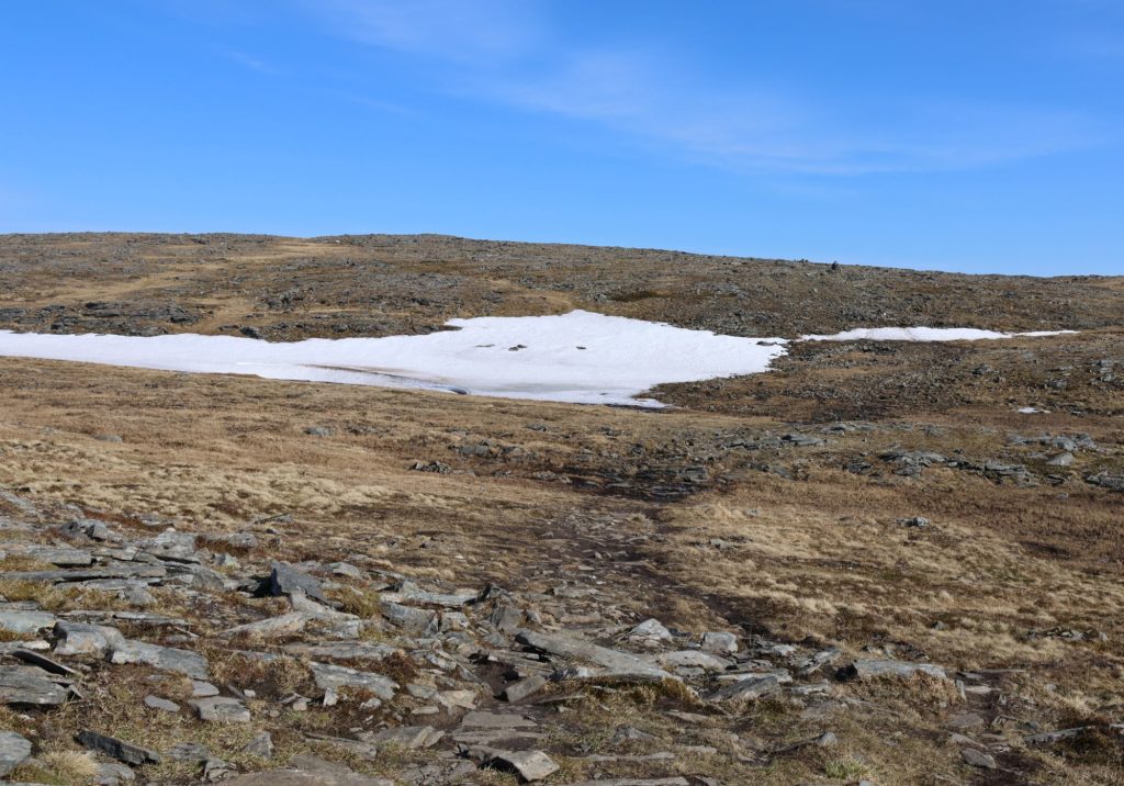 Für mich gab es dann noch ein zweites Highlight: eine Wanderung zum „wahren“ Nordkap. Dies liegt auf einer Landspitze daneben (Knivsjelodden) und etwas weiter nördlich. Allerdings ist dieser Punkt nur zu Fuß zu erreichen. Eine Strecke soll 9 km betragen und geht über Steinfelder, über Flüsschen und auch über Schneefelder. Da das Wetter mitspielt habe ich es durchgezogen. Platt – aber glücklich. Rolf ist zu Begin ein Stückchen mitgegangen, hat aber dann geduldig auf mich im Auto gewartet. Danke dafür!