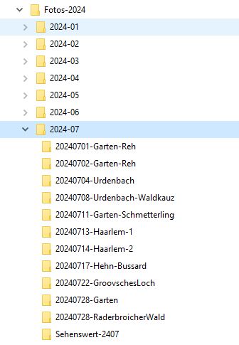 Ich habe mir im Laufe der Jahre folgendes System überlegt. Es gibt Hauptordner nach Jahren, darunter folgen Monate und darunter einzelne Tage mit den Bezeichungen von Ort und Inhalt. Das sieht dann im Prinzip so aus